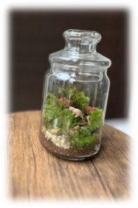 透明なガラス容器の中に数種類の苔や砂、石を使って風景を作ります。